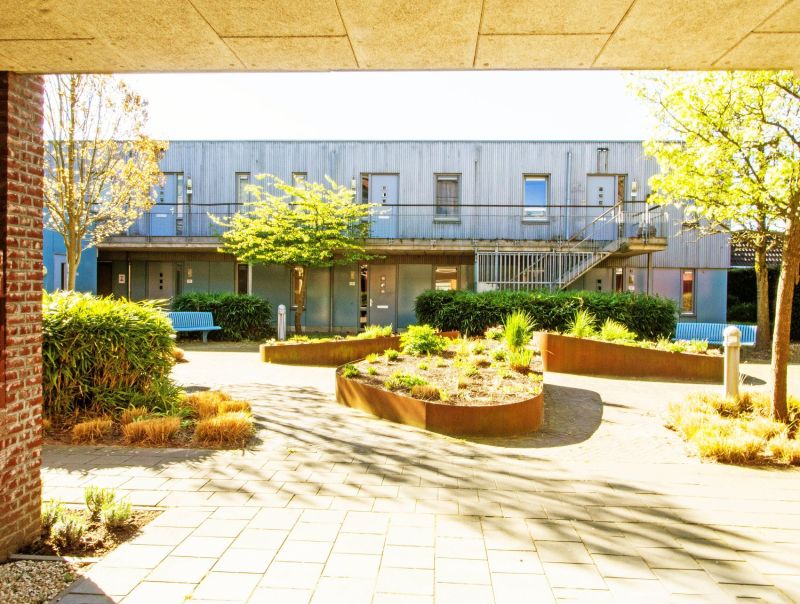 De Patronaatstraat met vlnr: 1. den nieuwbouw van de `Patronaatshof`, 2. de St.-